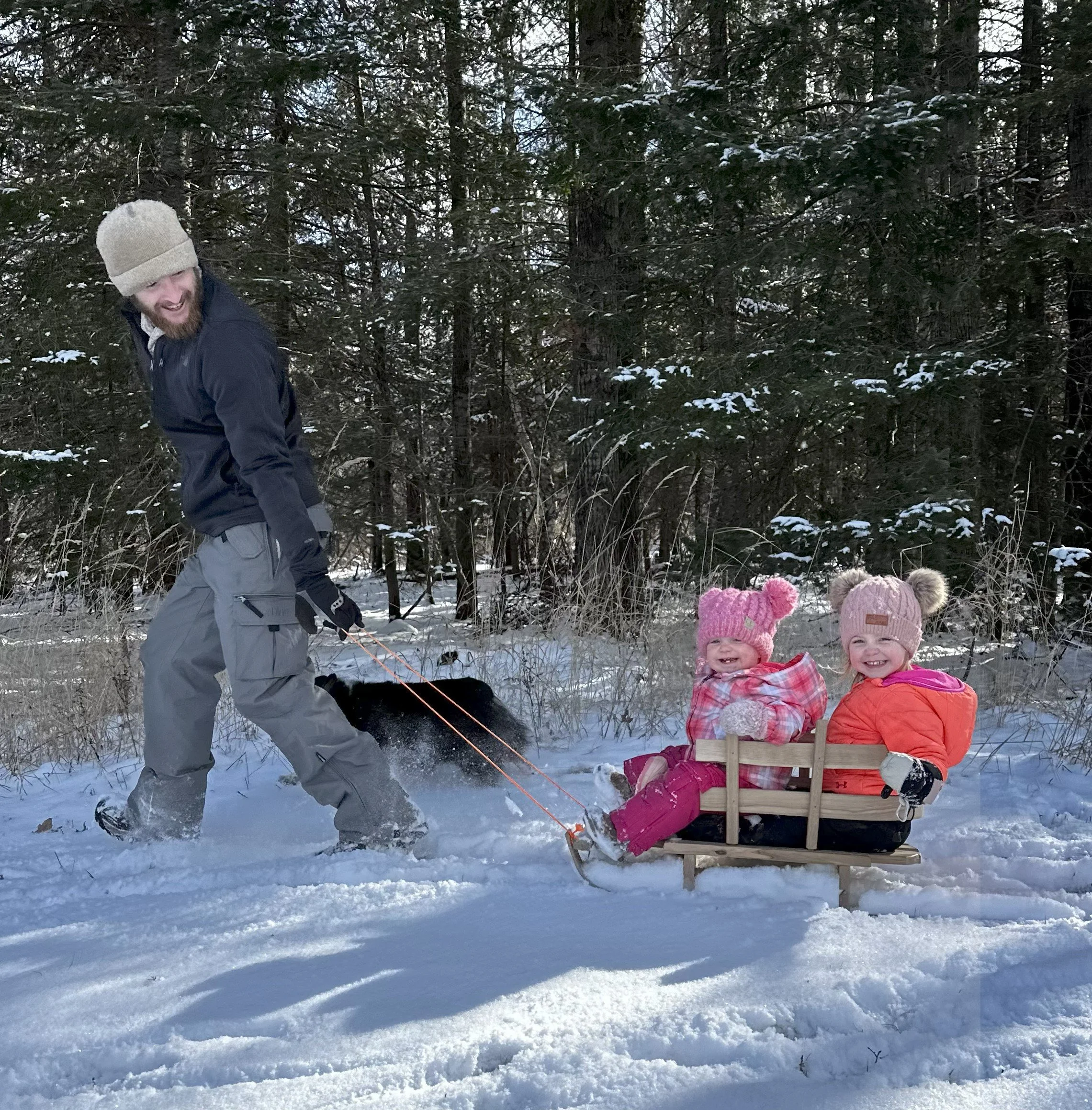 Myself with our two oldest daughters having a fun snow day and testing out an early pull sled prototype.
